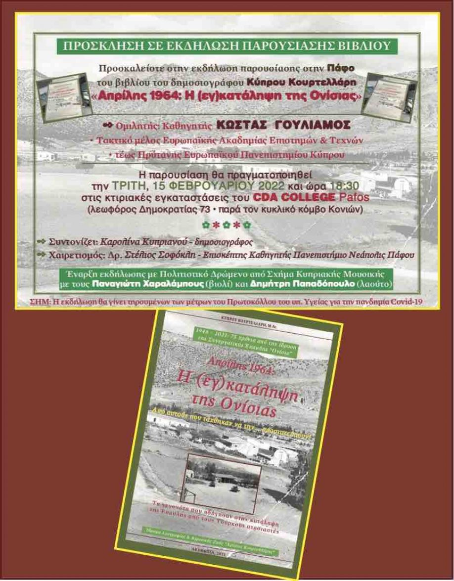 Η εκδήλωση παρουσίασης του βιβλίου «Απρίλης 1964: Η (εγ)κατάληψη της Ονίσιας», του Ονισιώτη δημοσιογράφου και συγγραφέα Κύπρου Κουρτελλάρη, πραγματοποιείται σήμερα Τρίτη στην Πάφο. Η εκδήλωση θα γίνει στις 18:30 στις εγκαταστάσεις του CDA College. Την παρουσίαση του βιβλίου θα κάνει ο Καθηγητής Κώστας Γουλιάμος, Τακτικό μέλος της Ευρωπαϊκής Ακαδημίας Επιστημών και Τεχνών και τέως Πρύτανης του Ευρωπαϊκού Πανεπισημίου Κύπρου.