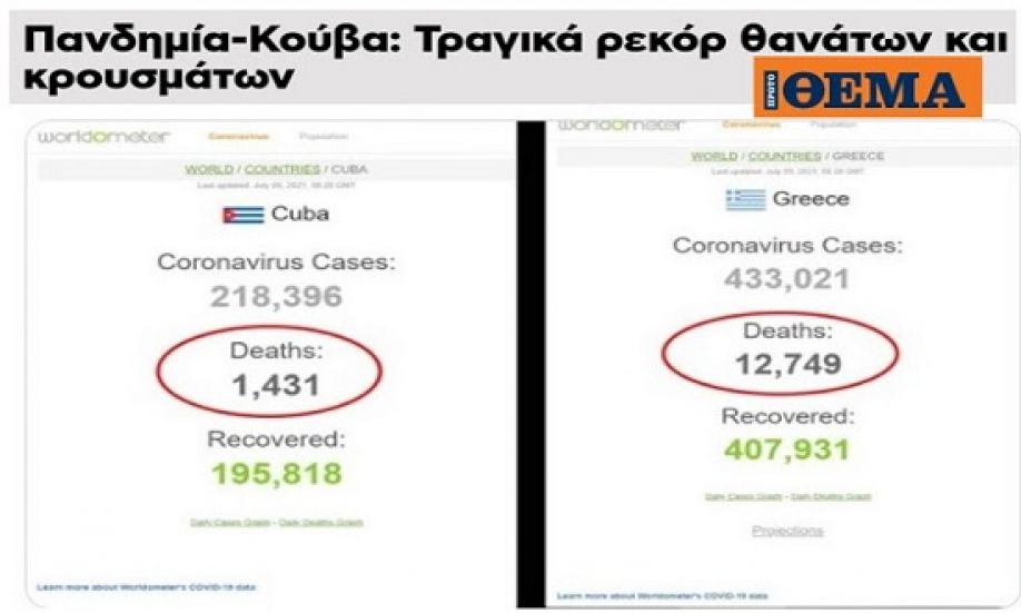 - Στην Κούβα έχουν καταγραφεί 1.431 νεκροί από την πανδημία. Στην Ελλάδα οι νεκροί πλησιάζουν τις 13.000.