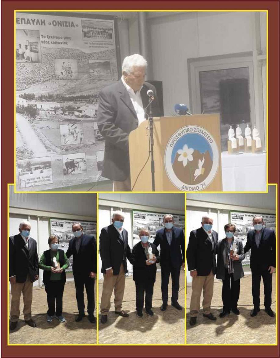 Γι’ αυτό κι εμείς σήμερα με πολύ σεβασμό γι’ αυτούς τους πρωτοπόρους και αγαπητούς Ανθρώπους, ως συμβούλιο του Σωματείου «Δίκωμο ’74», αποφασίσαμε να τιμήσουμε τους τελευταίους Ονισιώτες μαζί με τις συζύγους τους, που ήσαν μ,έλη της κολεκτίβας την περίοδο 1963-64. Ονομαστικά αυτοί είναι: Αριστόδημος και Αναστασία Ιωάννου, Μελής και Παρθενόπη Καραολιά, Κώστας και Μαρία Κληρίδη, Αντώνης και Ελένη Κόκκινου, Χρίστους και Μελανή Κουρτελλάρη, Γρηγόρης και Μαρία Λουΐζου, Γεώργιος και Χαμπους Μαυρίδη, Γώργος και Σαλώμη Μουζούρα, Πελοπίδας και Ελένη Πολυκάρπου, Χαράλαμπος (Κάρολος) και Χλόη Τουμανή, Γιάννης και Μαρίτσα Χαραλαμπή και Φιλόκυπρος και Αλεξάνδρα Χριστοδούλου.