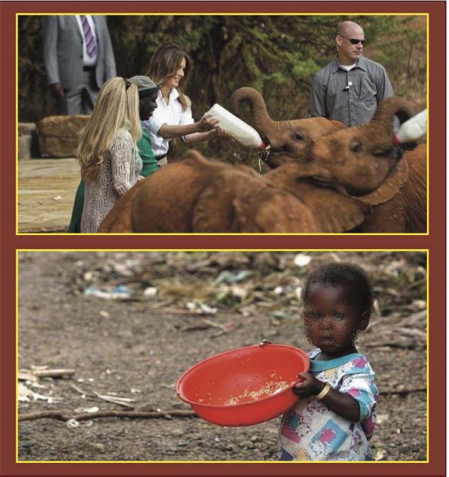 Και μετά προσγειώθηκε -εικάζω εγώ ο αφελής εκ του πολύ μακρόθεν- στην σκληρή του κόσμου πραγματικότητα: Η πρώτη κυρία των ΗΠΑ επισκέφθηκε, είπανε, ένα τοπικό ορφανοτροφείο, κράτησε στην αγκαλιά της τα μωρά και διάβασε ένα βιβλίο στα μεγαλύτερα παιδιά που τραγούδησαν και χόρεψαν προς τιμή της. Θέαμα, δηλαδή, τα ορφανά, προς τέρψη και... διασκέδαση της κυρίας πλανητάρχη! Δυστυχώς η φωτογραφία που είχε το ΚΥΠΕ ήταν από τα ελεφαντάκια, όχι από το ορφανοτροφείο... Προφανώς αυτή στείλανε τα διεθνή πρακτορεία, αυτή χρησιμοποίησε το ΚΥΠΕ. Κι έτσι δεν θα μάθουμε αν και στο ορφανοτροφείο η κυρία Τραμπ χαμογελούσε -όπως χαμογελούσε με τα ελεφαντάκια- ή αν δάκρυσε ολίγον, έστω και υποκριτικά... Ούτε μάθαμε -μηδέ θα μάθουμε ποτέ, λέω εγώ- αν η Μελάνια Τραμπ πληροφορήθηκε για τα εκατομμύρια των παιδιών -ανά την υφήλιο- που δεν προλαβαίνουν καν να μεγαλώσουν. Ή ακόμη αν η πρώτη κυρία των ΗΠΑ πληροφορήθηκε για την αύξηση της πείνας, το 2017, για τρίτη συνεχόμενη χρονιά... Με την Αφρική, στην οποία έκανε την περασμένη βδομάδα την περιοδεία της η κυρία Τραμπ, να έχει και στα δύο αυτά τις θλιβερές πρωτιές...