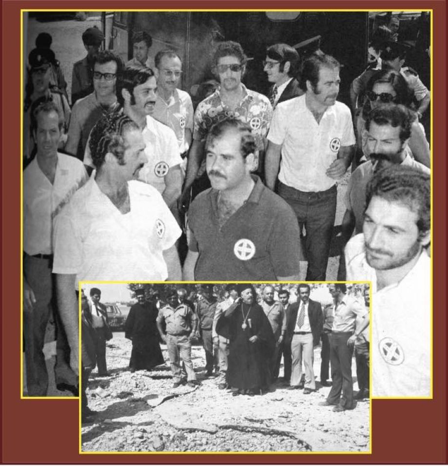 Φωτογραφία: Πάνω: "Περήφανοι" ΕΟΚΑΒητατζήδες με τον δικηγόρο τους -νεαρό, τότε- Νίκο Αναστασιάδη, στο προαύλιο του επαρχιακού Δικαστηρίου Λεμεσού το καλοκαίρι του 1973... Στην μικρή ένθετη φωτογραφία "έργα και ημέραι" της ΕΟΚΑ Β': Σκηνή λίγο μετά τη δολοφονική απόπειρα κατά του προέδρου της Δημοκρατίας Αρχιεπισκόπου Μακαρίου στις 7 Οκτωβρίου 1973... Άραγε, διατατεγαμένη υπηρεσία ήτανε κι αυτό;