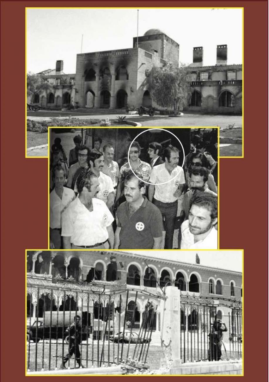 Φωτογραφία: Πάνω και κάτω το Προεδρικό και η Αρχιεπισκοπή όπως τα άφησαν οι πραξικοπηματίες μετά την αποφράδα ημέρα του χουντοφασιστικού εοκαβήτικου πραξικοπήματος. Στο κέντρο ΕΟΚΑΒητατζήδες στον περίβολο των δικαστηρίων Λεμεσού το 1973. Ανάμεσά τους -διακρίνεται στον μικρό κύκλο- ο Νίκος Αναστασιάδης, ο οποίος -ως νεαρός τότε δικηγόρος- ανέλαβε την υπεράσπισή τους...