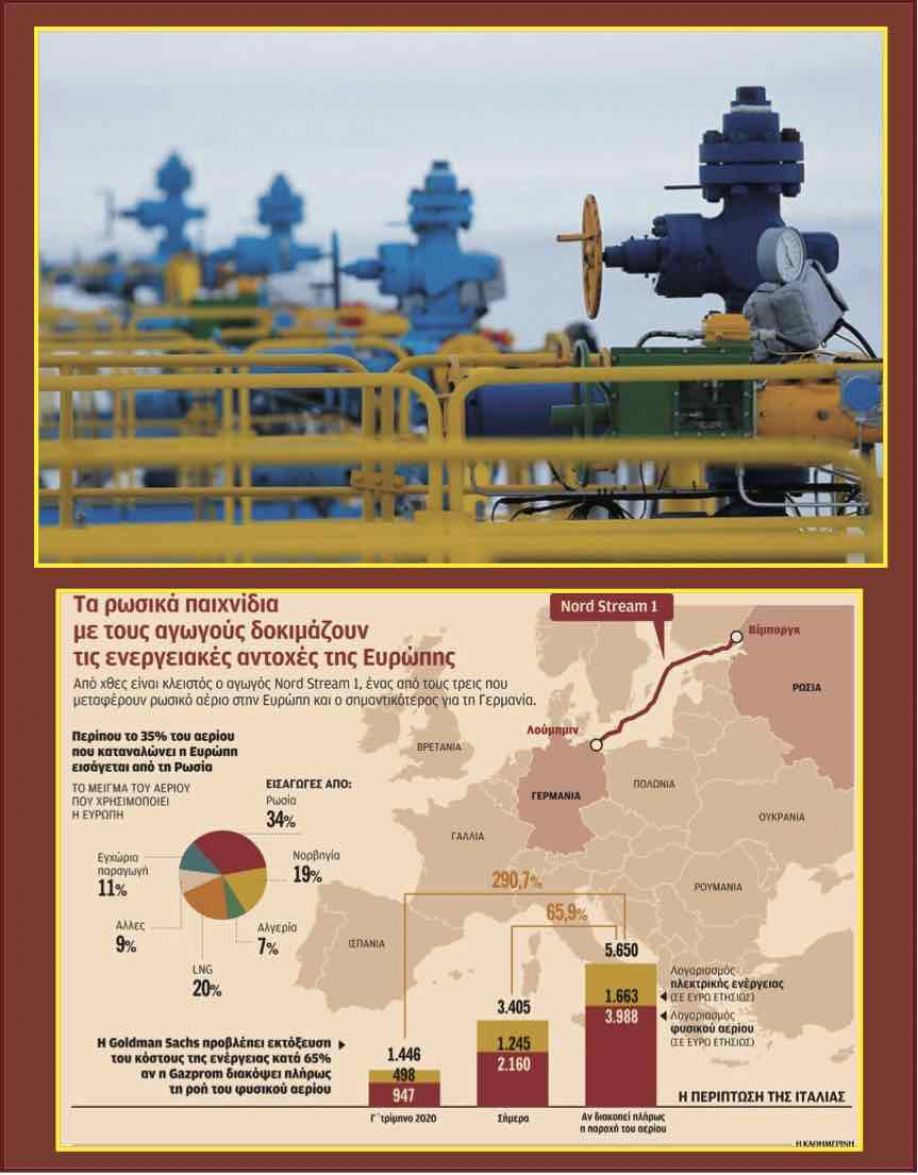 Ενα σενάριο κυριολεκτικά εφιαλτικό για τα ευρωπαϊκά νοικοκυριά αναδύεται μέσα από τις εκτιμήσεις της Goldman Sachs για την περίπτωση που η Μόσχα αποφασίσει πραγματικά να διακόψει πλήρως τη ροή φυσικού αερίου στην Ευρώπη. Ο επενδυτικός κολοσσός υπολογίζει πως στην περίπτωση αυτή θα καταστεί απρόσιτο και απαγορευτικό το κόστος του φυσικού αερίου και της ηλεκτρικής ενέργειας για τα ευρωπαϊκά νοικοκυριά, καθώς θεωρεί αναπόφευκτη μια νέα εκτόξευση των τιμών του φυσικού αερίου στην Ευρώπη προκειμένου να παραμείνουν βιώσιμες και κερδοφόρες οι εταιρείες πάροχοι. Προβλέπει, συγκεκριμένα, αύξηση του ενεργειακού κόστους κατά περίπου 65% πάνω από τα σημερινά ήδη δυσθεώρητα επίπεδα που ήδη υπερβαίνουν τα 170 ευρώ η μεγαβατώρα. Το αποτέλεσμα θα είναι η αντίστοιχη εκτόξευση των τιμών της ηλεκτρικής ενέργειας.