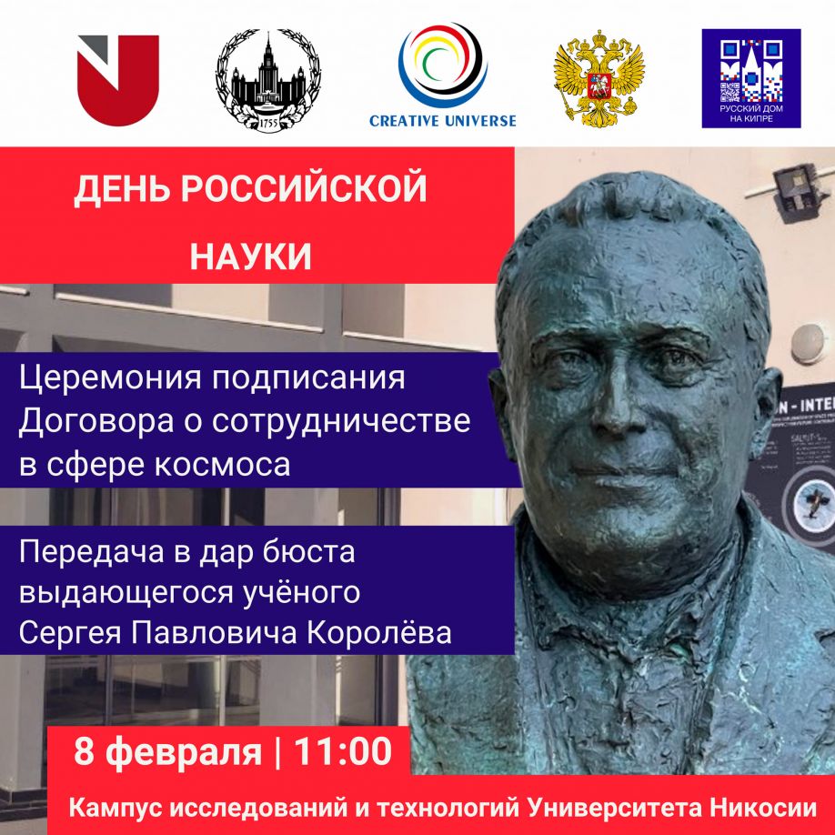 Στον ίδιο χώρο, στο Κτήριο Έρευνας και Επιστημών Μηχανολογίας του Πανεπιστημίου Λευκωσίας, ο Πρόεδρος του Φιλανθρωπικού Ιδρύματος “Creative Universe” Βιατσεσλάβ Ζαρενκόβ θα δωρίσει στο Πανεπιστήμιο Λευκωσίας την προτομή του εξαίρετου Σοβιετικού επιστήμονα, σχεδιαστή πυραύλων και διαστημικών συστημάτων, ενός από του παγκόσμιους πρωτοπόρους στον τομέα των πυραύλων και των διαστημικών τεχνολογιών Σεργκέι Κορολιόβ, έργο του διάσημου Ρώσου γλύπτη Αντρέι Τιρτίσνικοβ.