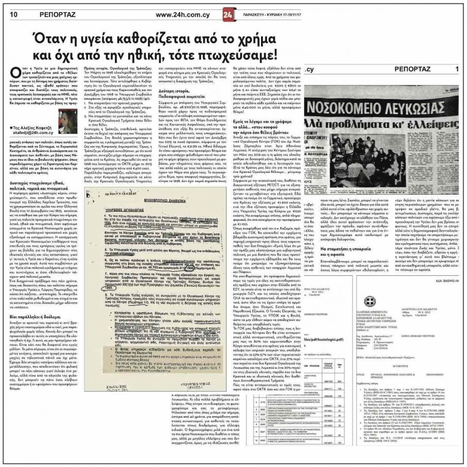 Καρκινοπαθείς θα αποστέλλονται στο ιδιωτικό Ογκολογικό του Ζάμπογλου στη Λεμεσό και δεν θα γίνει Κρατικό Ογκολογικό στο Νοσοκομείο της Λεμεσού, κατ’ απαίτηση των ιδιωτών και τραπεζιτών που το χρηματοδότησαν. Στη Λευκωσία επιδιώκουν να κλείσουν το Κρατικό Ογκολογικά του Γεν. Νοσοκομείου με τη συνδρομή του Πανεπιστημίου Κύπρου, γιατί οι τραπεζίτες δεν θέλουν και φοβούνται τον ανταγωνισμό. Στις Πρώτες βοήθειες πεθαίνουν ασθενείς περιμένοντας να τους δει γιατρός…