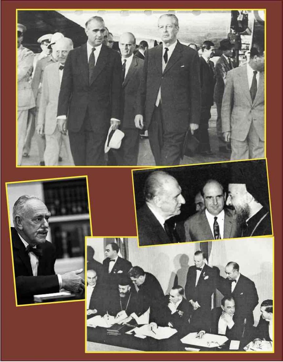 Φωτογραφίες: Πάνω: 7 Αυγούστου 1958. Ο Κωνσταντίνος Καραμανλής υποδέχεται στο αεροδρόμιο τον Χάρολντ Μακμίλαν, εμπνευστή του ομώνυμου σχεδίου που απορρίφθηκε. Κάτω: 16 Αυγούστου 1960, οι υπογραφές για εγκαθίδρυση της Κυπιρακής Δημοκρατίας πέφτουν με πάσα επισημότητα. Φεύ, όμως, πολύ σύντομα αρχίζει η αντίστροφη μέτρηση για... κατάλυσή της! Κέντρο, αριστερά, ο Αμερικανός διπλωμάτης Ντιν Άτσεσον, και δεξιά Γεώργιος Παπανδρέου και Μακάριος στην Αθήνα (6 του Μάη 1965). Γι’ αυτούς που από καταβολής της Κυπριακής Δημοκρατίας απεργάζονταν την κατάλυσή της, στο όνομα τάχαμου της ένωσης με την Ελλάδα, για όλα όσα έκτοτε έγιναν ίσαμε σήμερα φταίει ο Μακάριος!