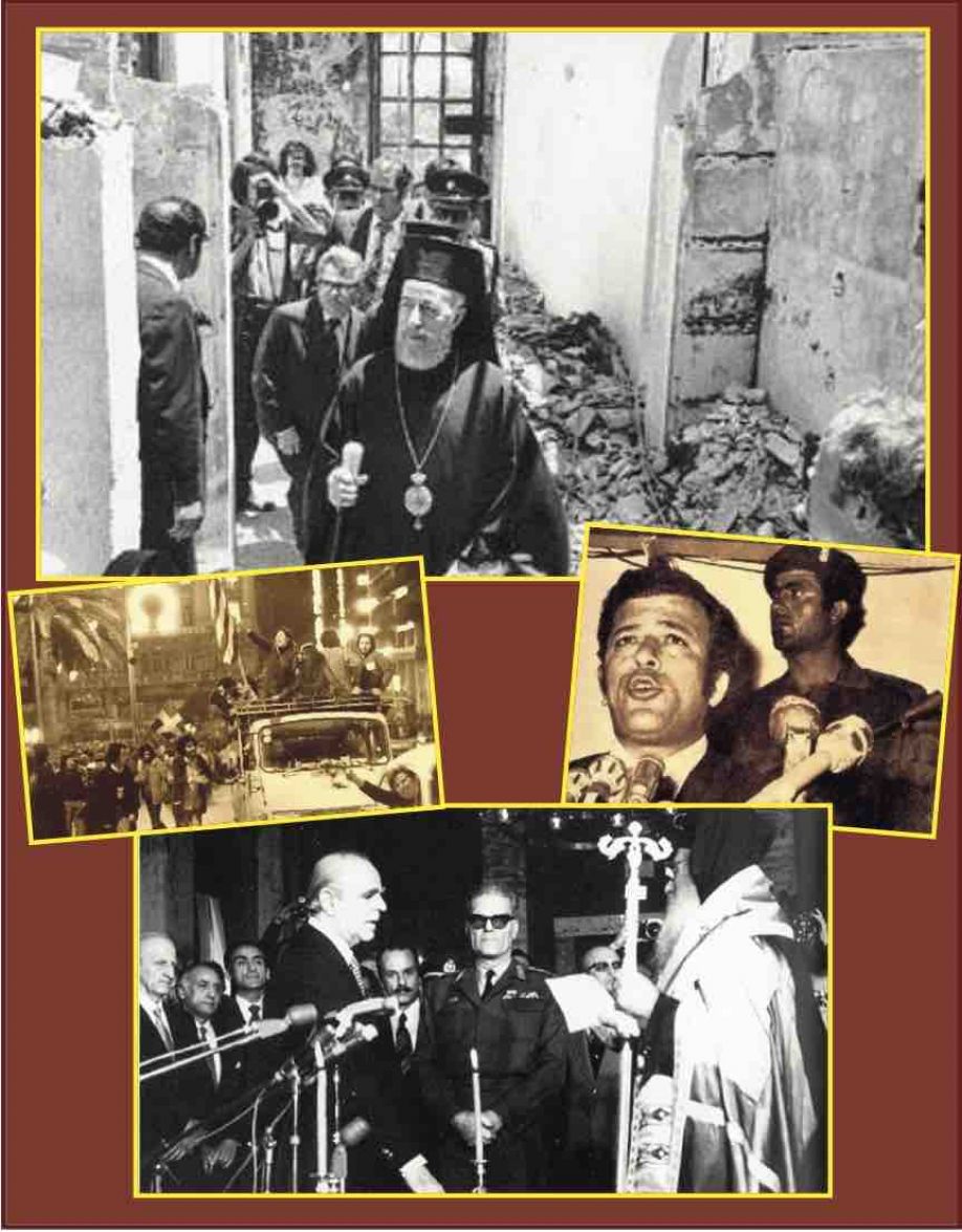 Φωτογραφία (πάνω): Ο πρόεδρος Μακάριος επισκέπτεται το καμένο από τους πραξικοπηματίες προεδρικό, μετά την επιστροφή του -τις 7 Δεκέμβρη 1974- στην Κύπρο. Κάτω: Από την ορκομωσία της υπό τον Κωνσταντίνο Καραμανλή κυβέρνησης «Εθνικής Σωτηρίας» στην Αθήνα, στις 24 Ιούλη 1974. Κέντρο αριστερά: Ο ελληνικός λαός ξεχύνεται στους δρόμους για να πανηγυρίσει την πτώση της χούντας. Ωστόσο το παλλαϊκό αίτημα «δώστε την χούντα στο λαό», ποτέ δεν ικανοποιήθηκε κι έτσι οι μηχανισμοί και οι -πλείστοι- υπηρέτες της χούντας παρέμειναν και στην μεταπολίτευση... Κέντρο δεξιά: Ο οκταήμερος πρόεδρος της πραξικοπηματικής κυβέρνησης, Νίκος Σαμψών, προβαίνει σε δηλώσεις υπό το βλέμμα ένοπλου εοκαβητατζή που εκτελεί χτέη φρουρού του...