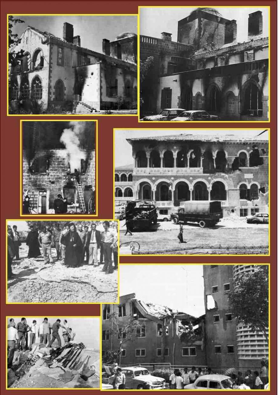 Φωτογραφία: Απτά δείγματα της πραγματικής απόπειρας κατάλυσης του κράτους στις 15 Ιουλίου 1974, αποτυπωμένη στο προεδρικό Μέγαρο και την Ιερά ΑΡχιεπισκοπή (πάνω και κέντρο δεξιά), αλλά και της προ του ’74 κατάστασης: απόπειρες δολοφονίας του εκλεγμένου αρχηγού του κυπριακού κράτους, Προέδρου Μακαρίου, ανατινάξεις αστυνομικών σταθμών, δολοφονίες πολιτών, απαγωγές προσώπων και ένοπλη παράνομη δράση από την ΕΟΚΑ Β’...