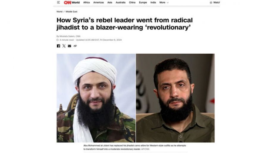 Το CNN -που το 2013 είχε χαρακτηρίσει τον Τζολάνι «έναν από τους δέκα πιο επικίνδυνους τρομοκράτες στον κόσμο», γνωστό για απαγωγές, βασανιστήρια και σφαγές φυλετικών και θρησκευτικών μειονοτήτων- έχει βρεθεί στην αιχμή του δόρατος της ευρωατλαντικής προπαγάνδας. Την ώρα που οι «αντάρτες» του βρίσκονταν έξω από τη Δαμασκό, ο Τζολάνι έδινε αποκλειστική συνέντευξη στο αμερικανικό δίκτυο.