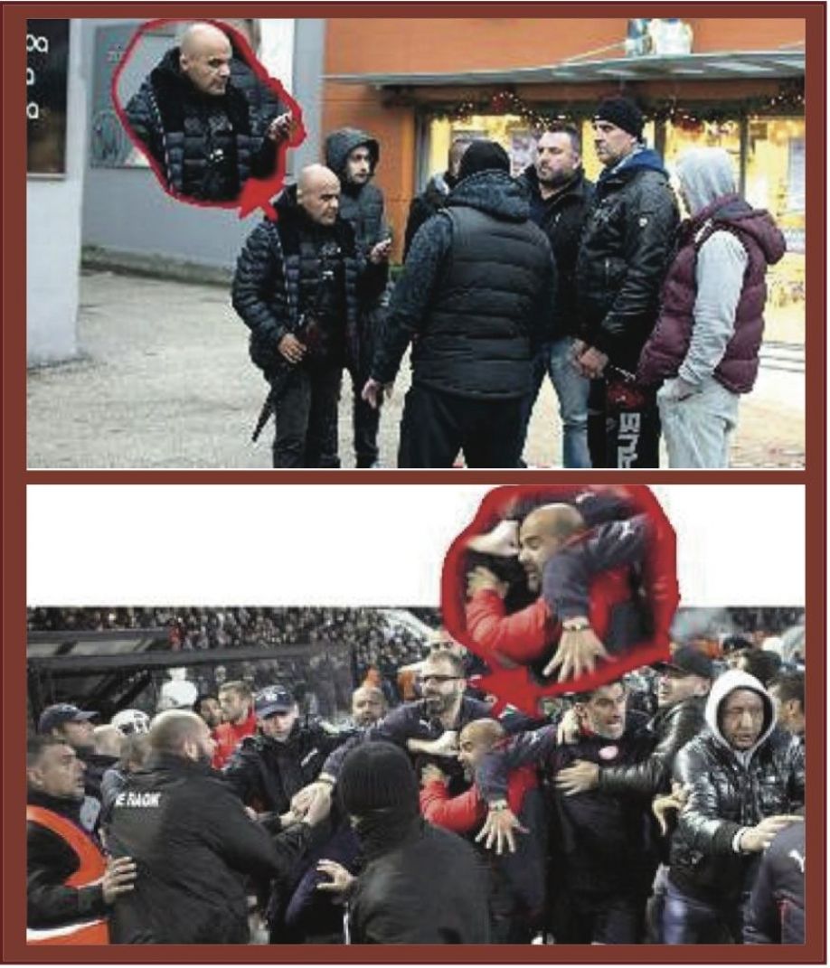 Στη φωτογραφία (πάνω) διακρίνεται αριστερά ο καραφλός τραμπούκος να κρατά μια ομπρέλα και να σχεδιάζει με τους συνεργούς του την επίθεση στους εργαζόμενους. Κάτω στη φωτογραφία, στο κέντρο διακρίνεται ο ίδιος τύπος να εμπλέκεται σε επεισόδια μέσα στον αγωνιστικό χώρο της Τούμπας, σε αγώνα ΠΑΟΚ - Ολυμπιακός